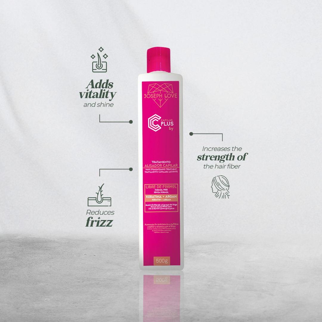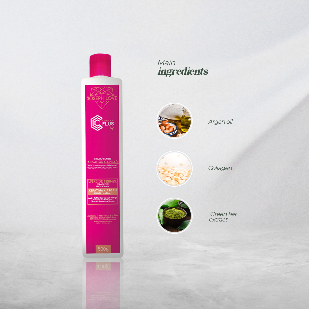 Es un tratamiento de alisado capilar enriquecido con ingredientes naturales como aceite de argán, aceite de oliva, colágeno, aceite de jojoba, aceite de germen de trigo, extracto de té verde, extracto de aloe vera, proteína de seda, pantenol, queratina y aceite de marula.